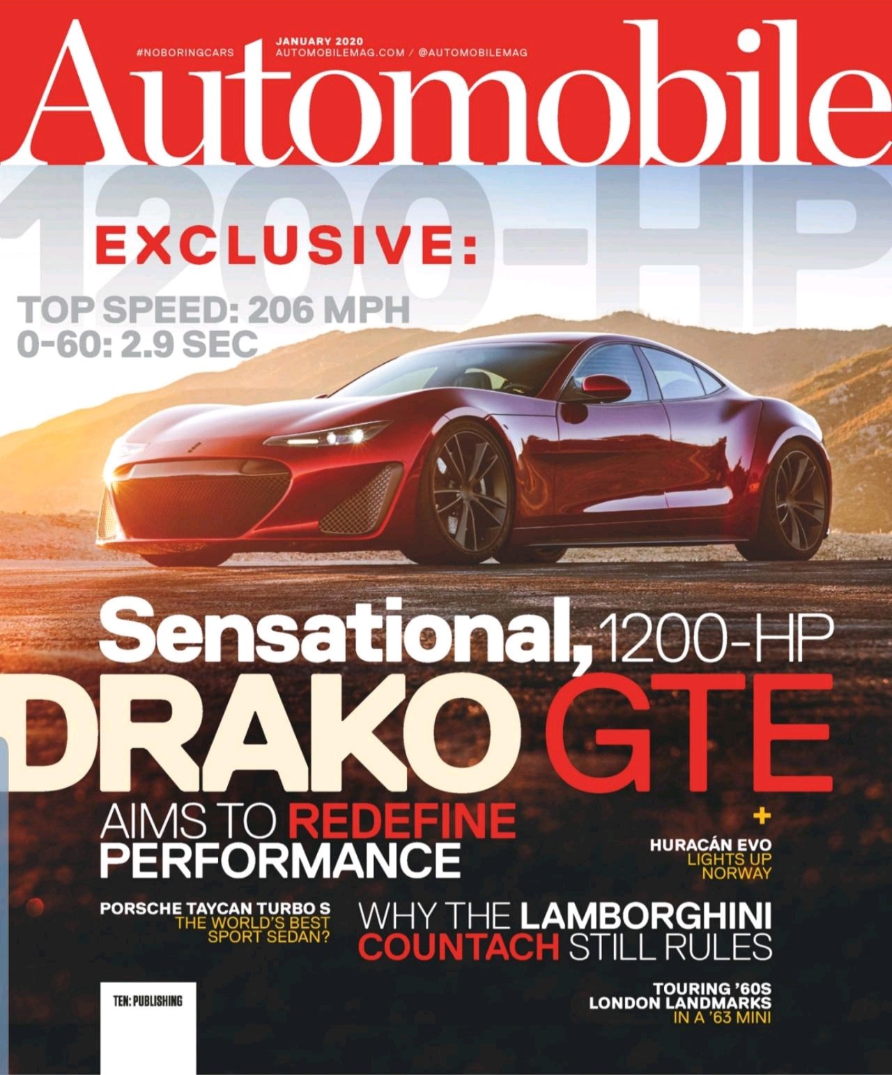 Automobile Magazine describes GTE as "Revolutionizing Performance Driving". The author continues, "As striking as the GTE’s exterior is, the sculpted look is merely an appetizer. It’s indeed what lies underneath - namely, an innovative battery, four electric motors, and proprietary Drako DriveOS software to run it all - that truly sets this new supercar apart". Read the full eight-page Drako GTE feature in the January 2020 issue of Automobile Magazine, available now on magazine stands.